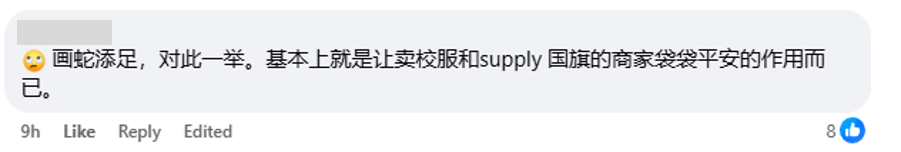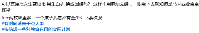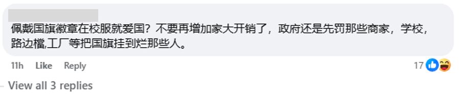 至于网民的反应,大部分都是弹多过赞,认为教育部多此一举,指佩戴国旗徽章无助于学生培养爱国之心,反而多了一条校规须遵守。