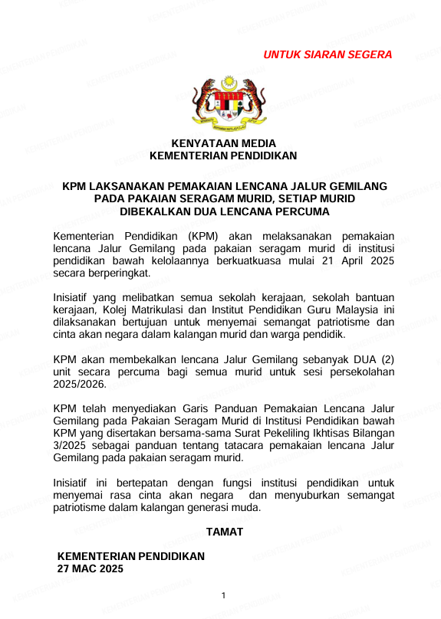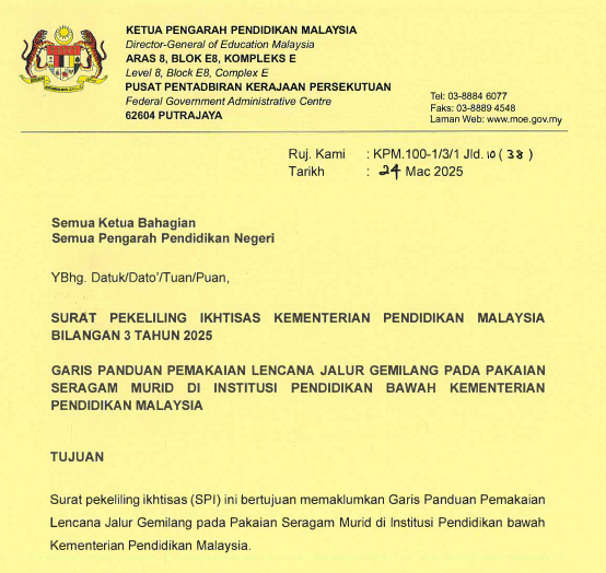 教育部昨天(3月26日)在官网发布通告,指示所有政府学校、政府资助学校、预科学院及师范学院的学生,都必须佩戴“辉煌条纹”。
