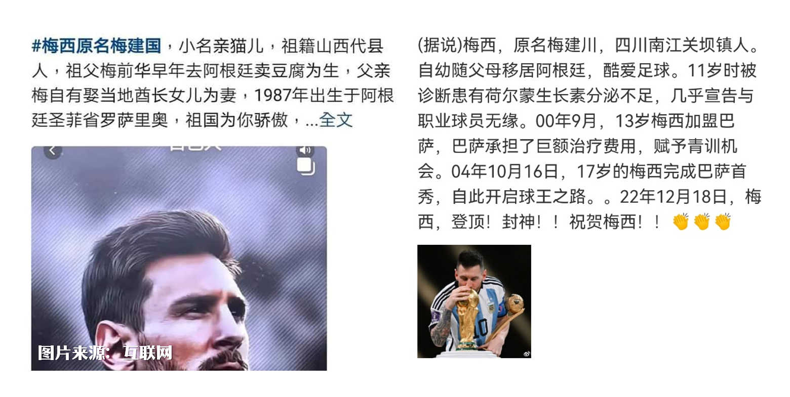 如今全球正掀起一股“梅西旋风”,而中国各大社交媒体也有人跟着要“沾光”,还发布梅西是中国人的贴文,引发疯传。
