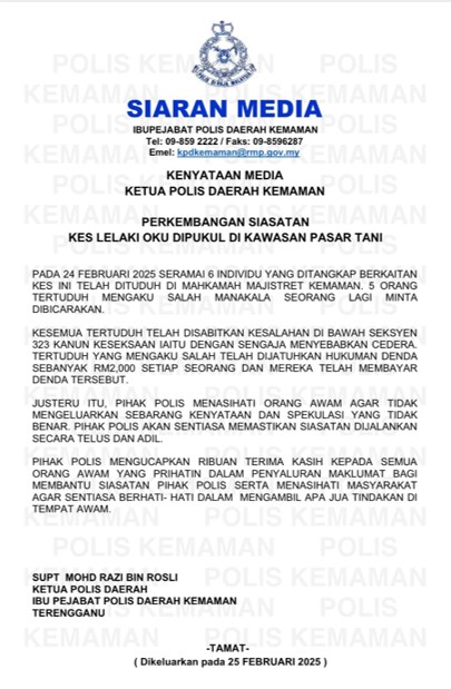 登嘉楼甘马挽一名智力残疾男子,上个月在市集遭围殴拖行并被“游街示众”的案件,前天(2月24日)在甘马挽地庭审理。六名嫌犯当中,五人认罪并被处以RM2,000的罚款。