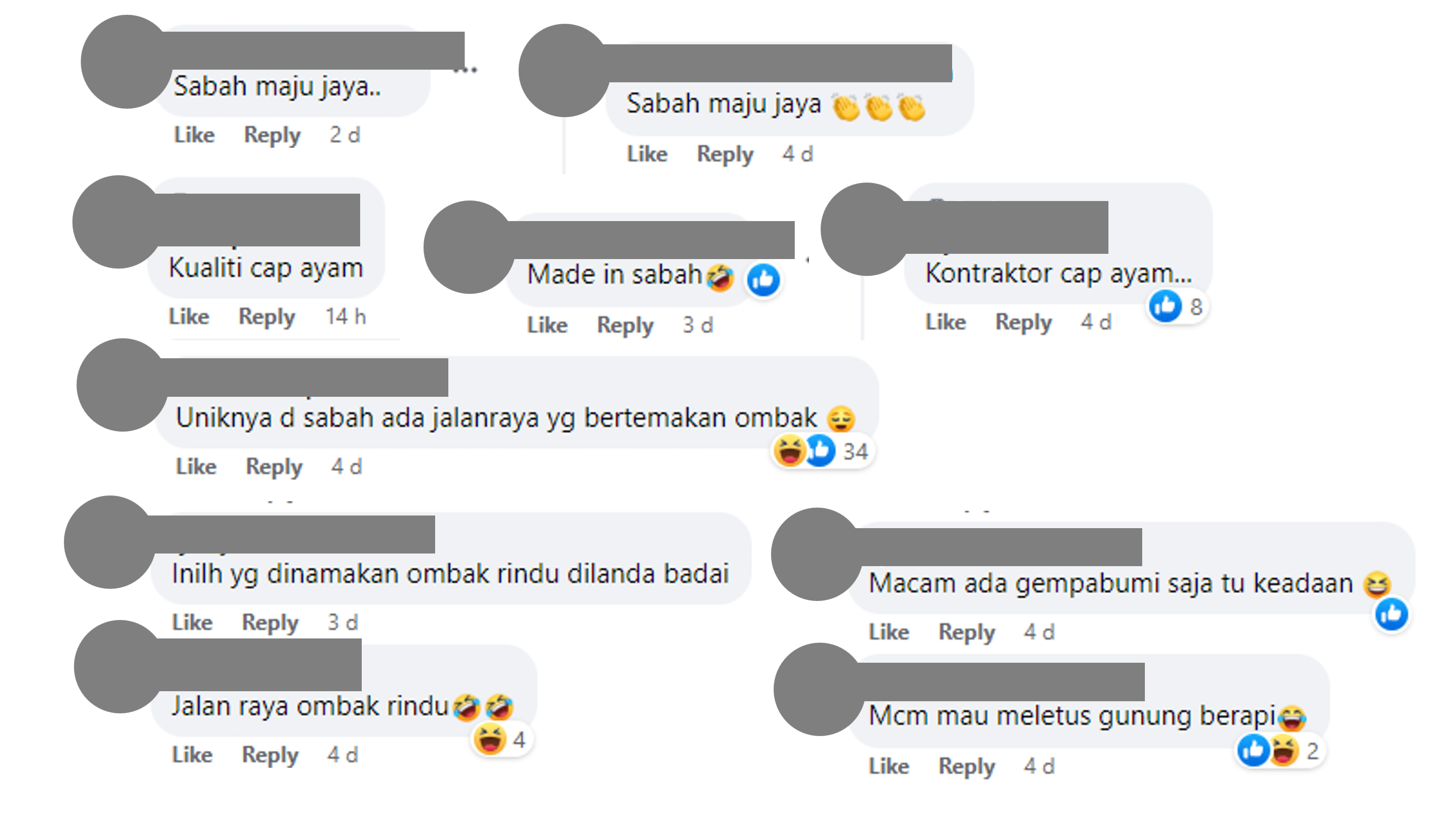 也有网民调侃说:“沙巴万岁!”、“这就是沙巴制造”、“这是沙巴的特点,有海浪主题的马路。”、“火山要爆发了”,似乎对当地糟糕的路况,已经感到习以为常。