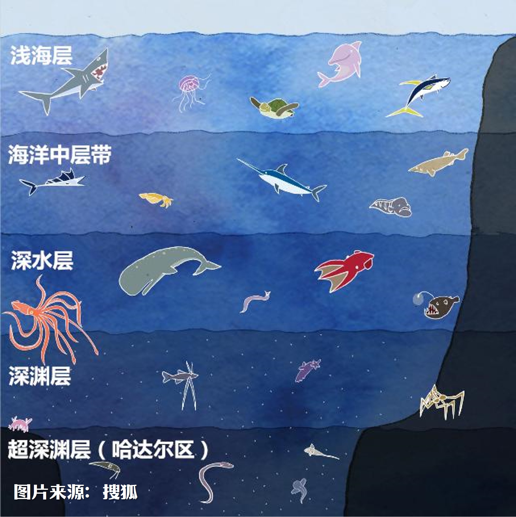 在地理学上,海洋深度被分为5个区域,越深的区域接收到的经由海平面透下来的光就越少,从上至下分别为: