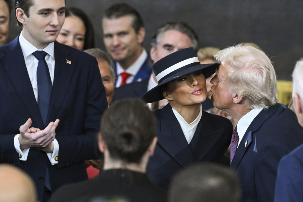 特朗普在宣誓仪式后,本想亲吻妻子梅拉尼娅,但由于梅拉尼娅的帽子围边太大,无法亲到脸颊,而特朗普在“空中飞吻”的场面,也正好被在场摄影师捕捉到。