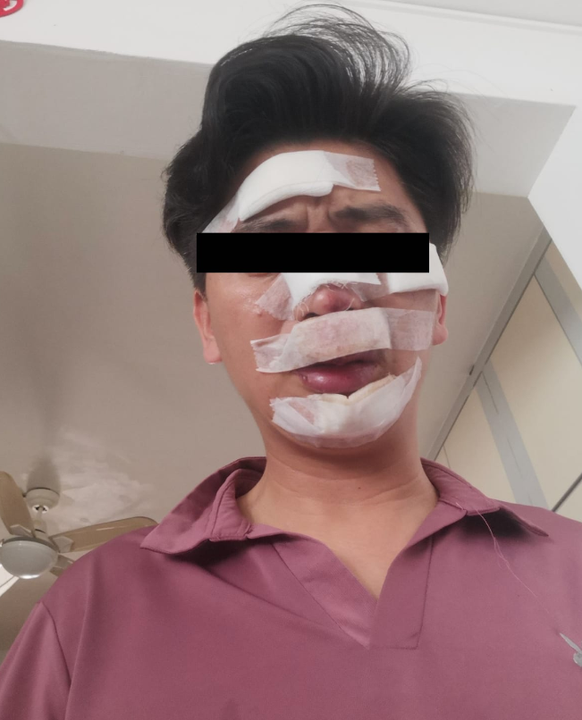 为了从绑匪手中救出儿子,商人的脸部、手臂多处受伤,鼻子和嘴唇擦伤,还掉了两颗牙齿。(图片取自新加坡《慈母舰》网站)