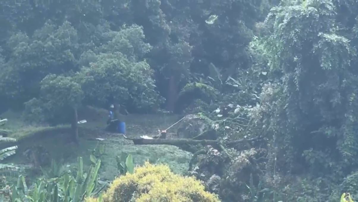 电锯声在园中响起,榴梿树一棵接一棵倒下,彭亨执法小组过去3天在彭亨劳勿非法榴梿园展开清除工作,预计已有上千棵榴梿树被摧毁。