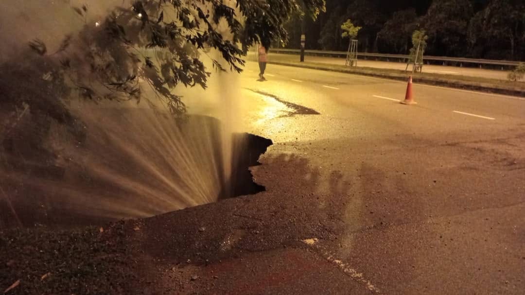 有关路段据悉是在今日凌晨12AM下陷,爆裂的水管也让该路段,犹如一座喷水池般。