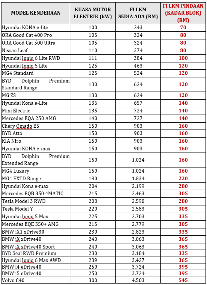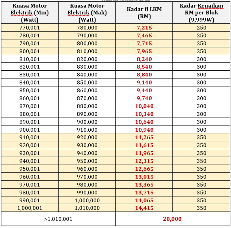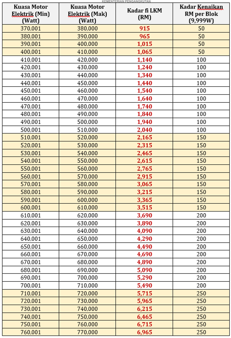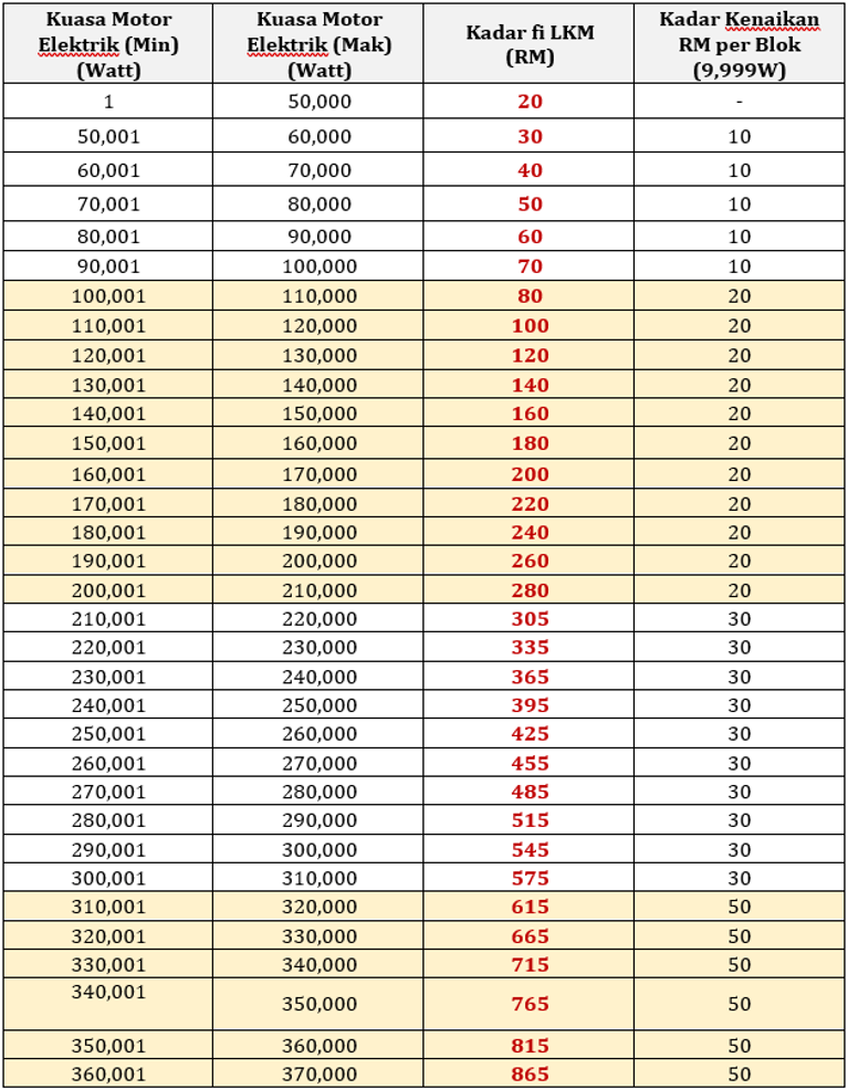 每增加9,999瓦特(Watt)的功率,则将按组别收取RM10以上的费用,计算方式如下: