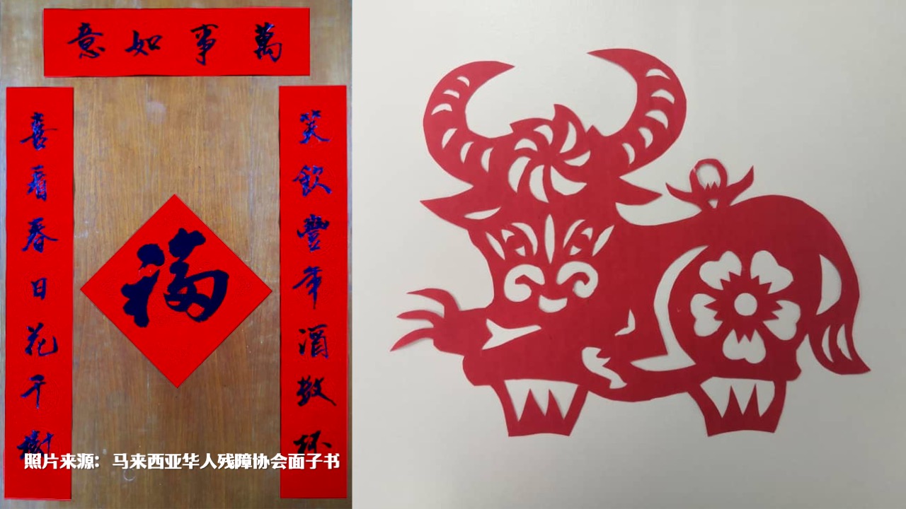 传统书法和民间剪纸,这个流传千年的中国书写与视觉艺术。除了讲求细心和耐心,更是高度要求人们手部的精准力道。然而,对于这些因为疾病或意外导致双手无力的残障朋友来说,单单要提起毛笔就已经不是件容易的事,要写得一手好字,更是难上加难。大马华人残障协会理事林俊华因无法控制双手和没腰力,而拿了个带子捆绑控制双手,写上个好字。他的举动也感动了大马华人残障协会总秘书谢秀贞,促使她充满了动力,并模仿了林俊华的举动,一同写上个寓意满满且真诚的字迹。