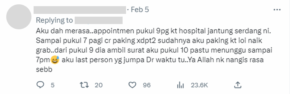 “我也经历过……在沙登医院心脏科的预约是9AM,7AM的时候我就抵达了,把车停到附近的购物商场,再乘搭电召车到医院。从9AM办理手续后,我等到了7PM,成为当天的最后一名求诊者,真的欲哭无泪。”