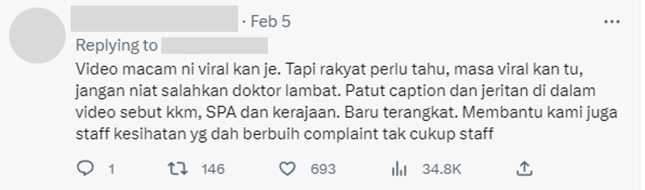 “这种影片可以疯传,但人民必须理解,在分享影片时,不能责怪医生动作太慢。必须在说明栏标记卫生部、公共服务局和政府,问题才会被挑起。也顺便帮助这些医务人员发声投诉人手不足。”