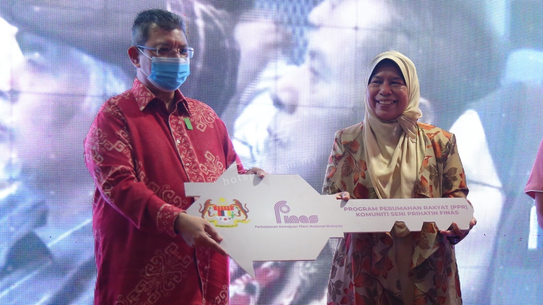 祖莱达与通讯部长赛夫丁今天出席一项人民组屋计划(PPR)移交信函仪式,同时推广社区艺术关怀计划(Program Perumahan Komuniti Seni Prihatin),为25名艺术家提供组屋,以鼓励我国社区艺术发展。