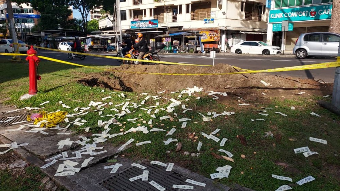 这宗树倒砸死人事件发生在4月27日10AM,在大路后(马加查餐室前)发生。媒体记者今日再次返回事发现场时发现,树倒后造成的坑洞仍未填补,但可见坑洞外围插着清香、冥纸等拜祭用品。