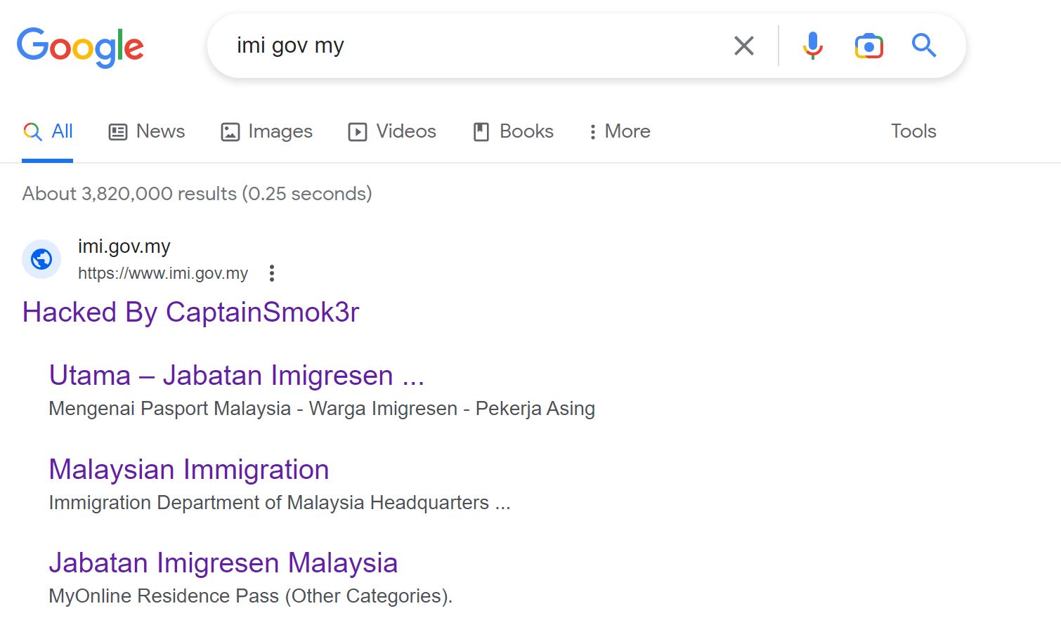 只是在谷歌搜索引擎搜寻移民局官网时,官网链接下方仍留有“被CaptionSmok3r骇入”的字样,而早前骇客在网站注解留下的字句(CaptionSmok3r到此一游,纯属好玩)已被移除。