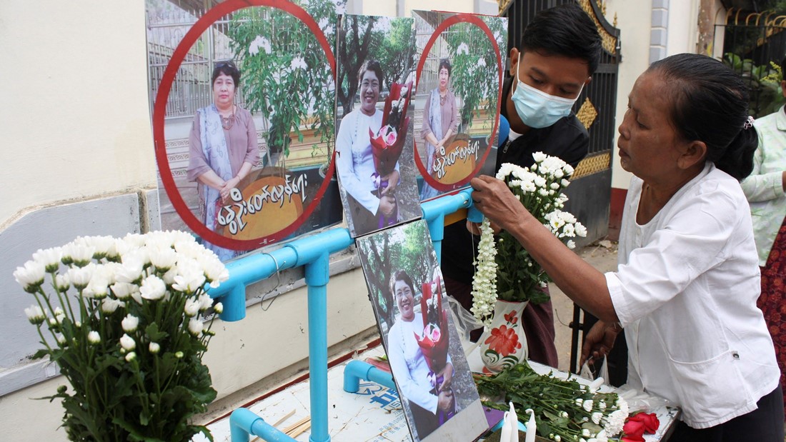 缅甸民众向在示威中身亡的同伴献花致意。