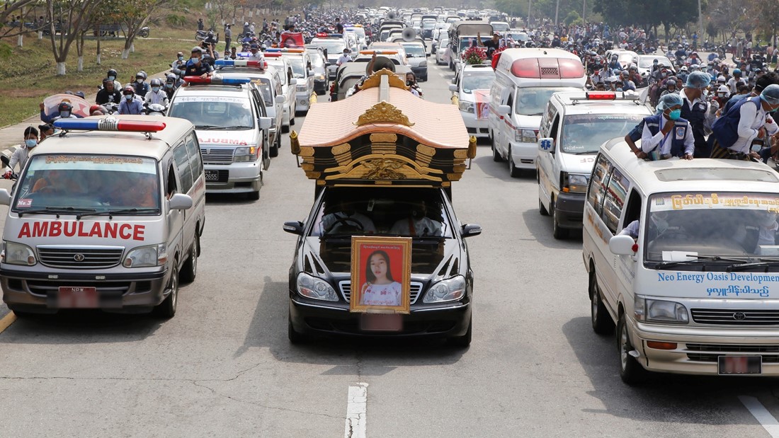 成千上万人在缅甸第二大城市曼德拉和平集会,为反政变示威中首位丧命的示威者妙兑兑凯举行葬礼。