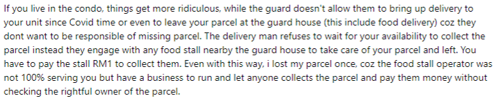 “如果你住在公寓里,事情会更荒谬。自新冠疫情以来,警卫就不允许快递员将包裹送到单位,甚至不允许将包裹留在警卫室,因为警卫不想为丢失的包裹负责。 快递员不想等你来领取包裹,而是将包裹寄放给附近的摊贩。你必须支付摊贩RM1,才能领取包裹。”