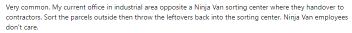 “这很普遍,我的公司在工业区,对面是‘Ninja Van’的分拣中心,顾客在那里将货物交给承包商,其员工会在在外面对包裹进行分类,然后将剩余的包裹扔回分拣中心。‘Ninja Van’的员工才不会在乎。”