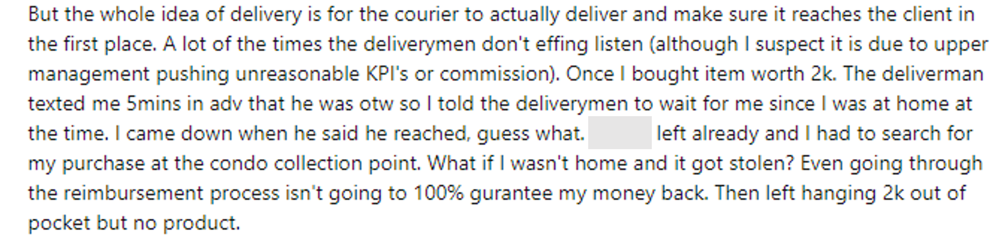 “有一次我买了价值2千的商品,快递员提前 5 分钟给我发信息。当时我在家,所以我让送货员等我。当他说他到达时,我已经下楼了。但是快递员已经离开了,我不得不在公寓收集点,寻找我的包裹。如果我当时不在家,包裹被偷了怎么办?”