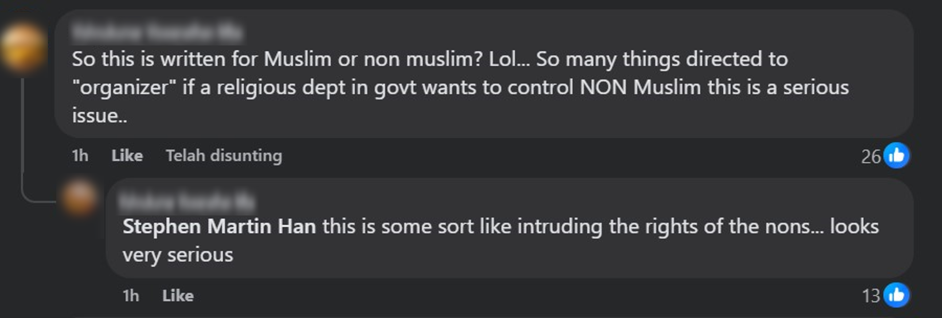 “这项指南是在针对穆斯林还是非穆斯林?感觉很多事情都在指向主办方,如果政府的宗教部想要控制非穆斯林,这是一件非常严重的问题。”