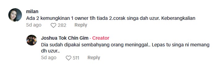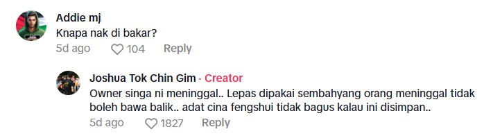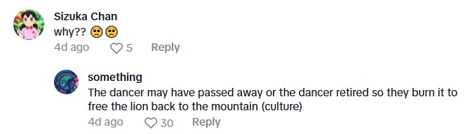针对网民们的疑问,男子在留言区解释,由于这套舞狮的“主人”已经离世,并且在其主人的祭拜仪式被使用,因此根据华人风水和传统习俗,这套舞狮必须被烧毁。