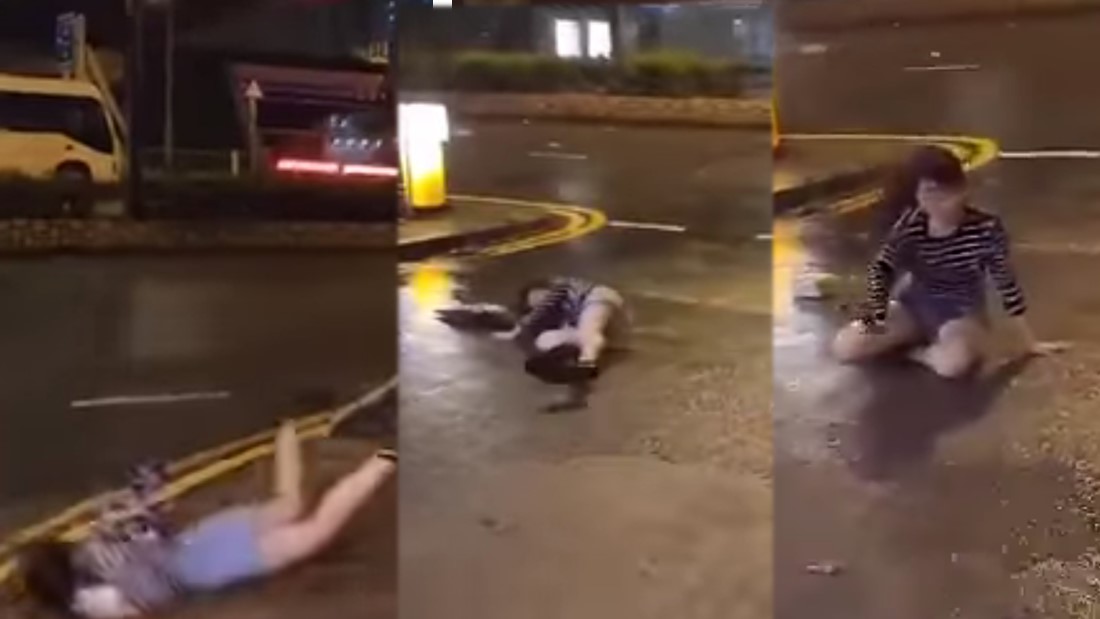 “苏拉”台风昨晚(9月1日)登陆香港,香港疯传一段7秒影片,影片一开始只见一名女子在香港调景岭地铁站附近,被暴风吹着“喷出”,她脸部朝下,被风猛吹,一路像“溜冰”一样滑行到马路中央,一旁的雨伞也被吹走。