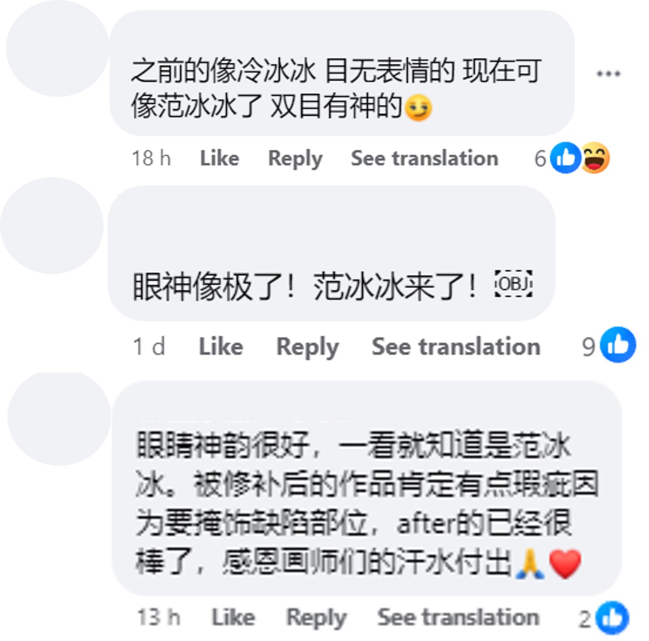 “之前的像冷冰冰目无表情的,现在可像范冰冰了,双目有神”
