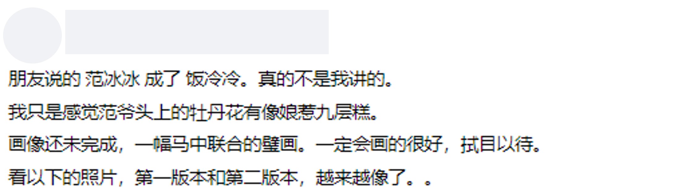 “我觉得很像,一眼望去就看出是范爷了,很棒!在墙壁上作画是不简单的,你们以为容易吗?”