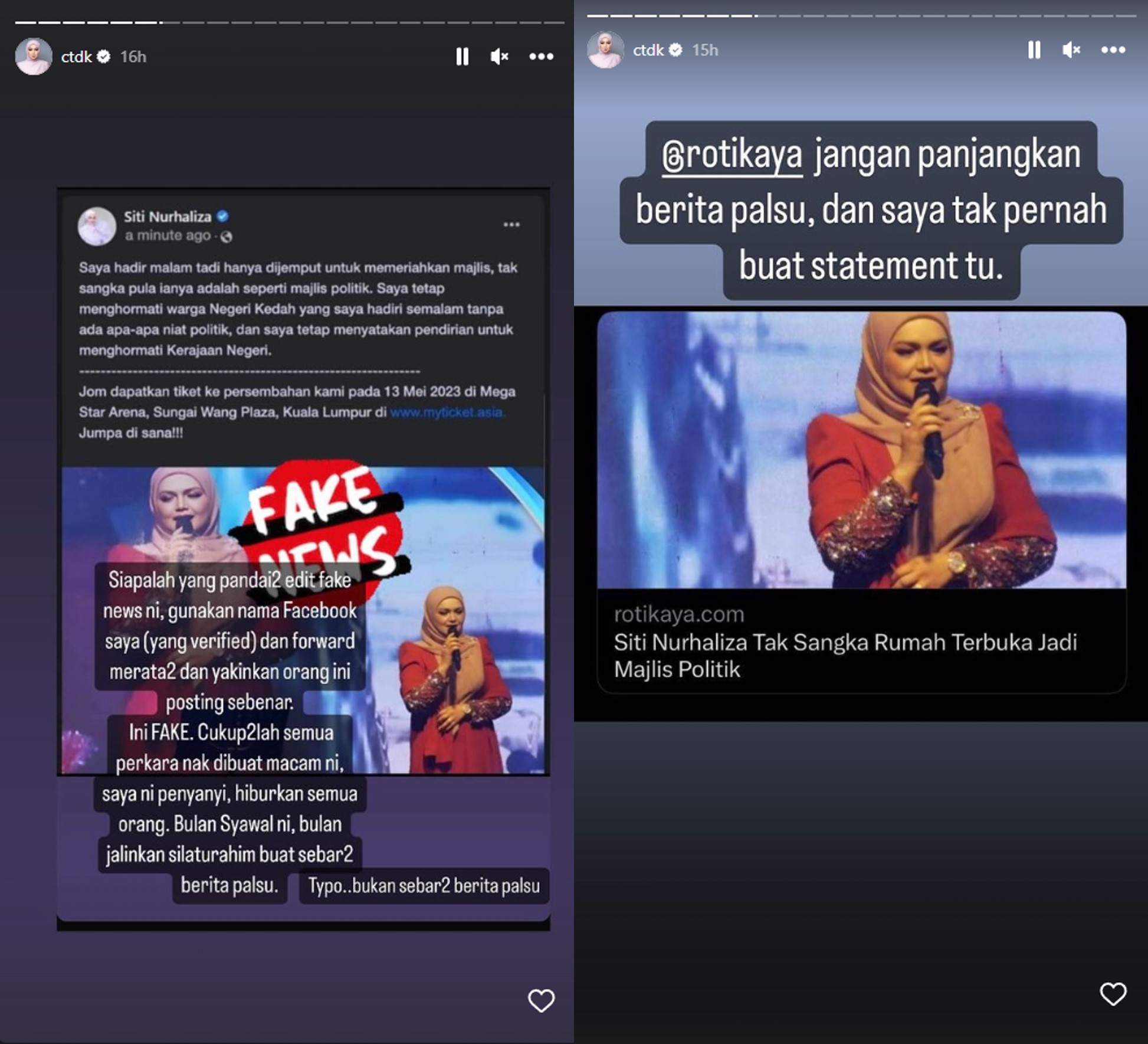 .@CTNurhaliza11 tegur @rotikaya tentang berita palsu yang ditulis laman itu.