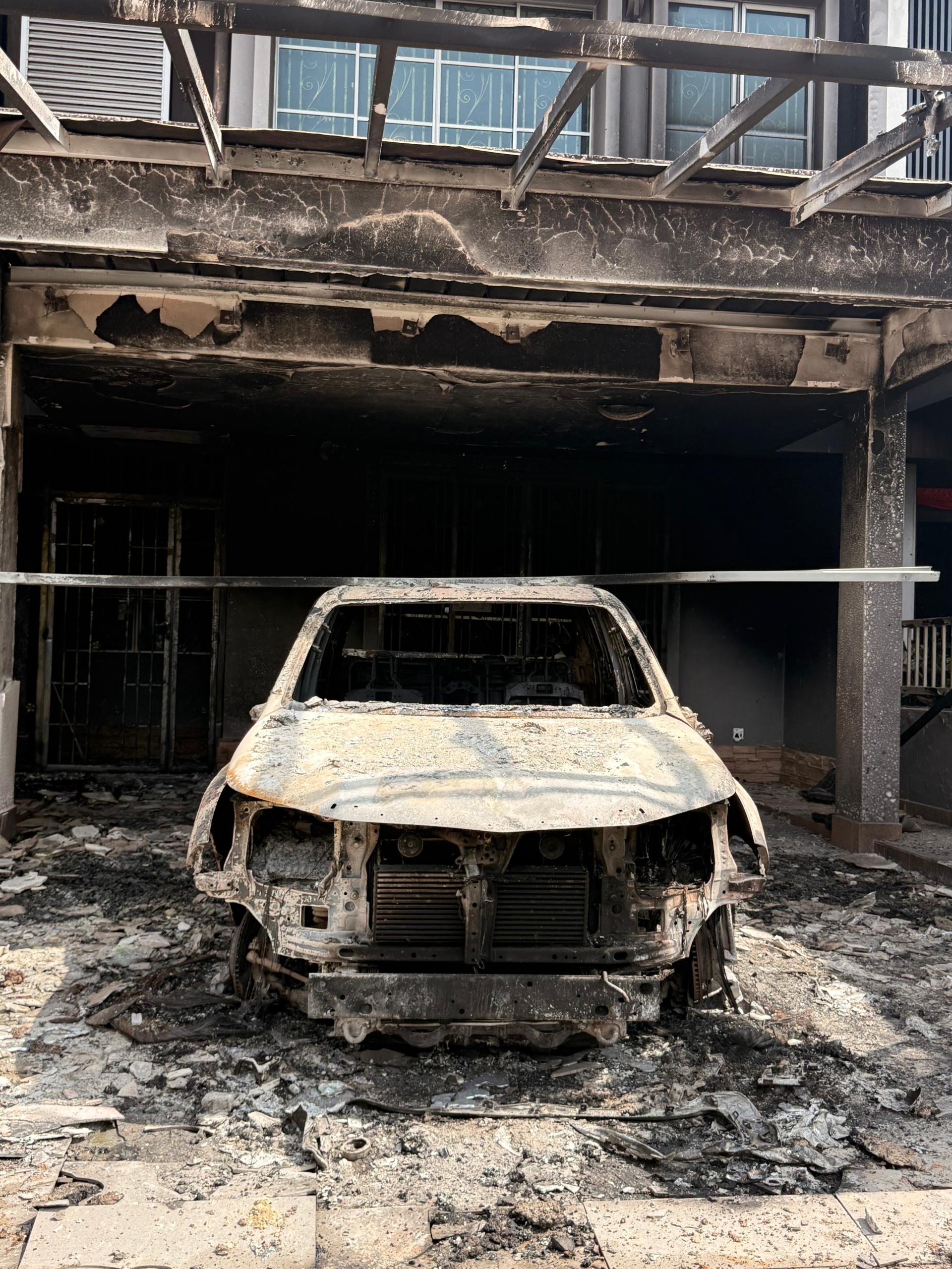一辆汽车完全被烧毁,停放在住宅的车库内,可见车身已被高温炙烤变形,车窗和车灯完全消失,露出内部框架。