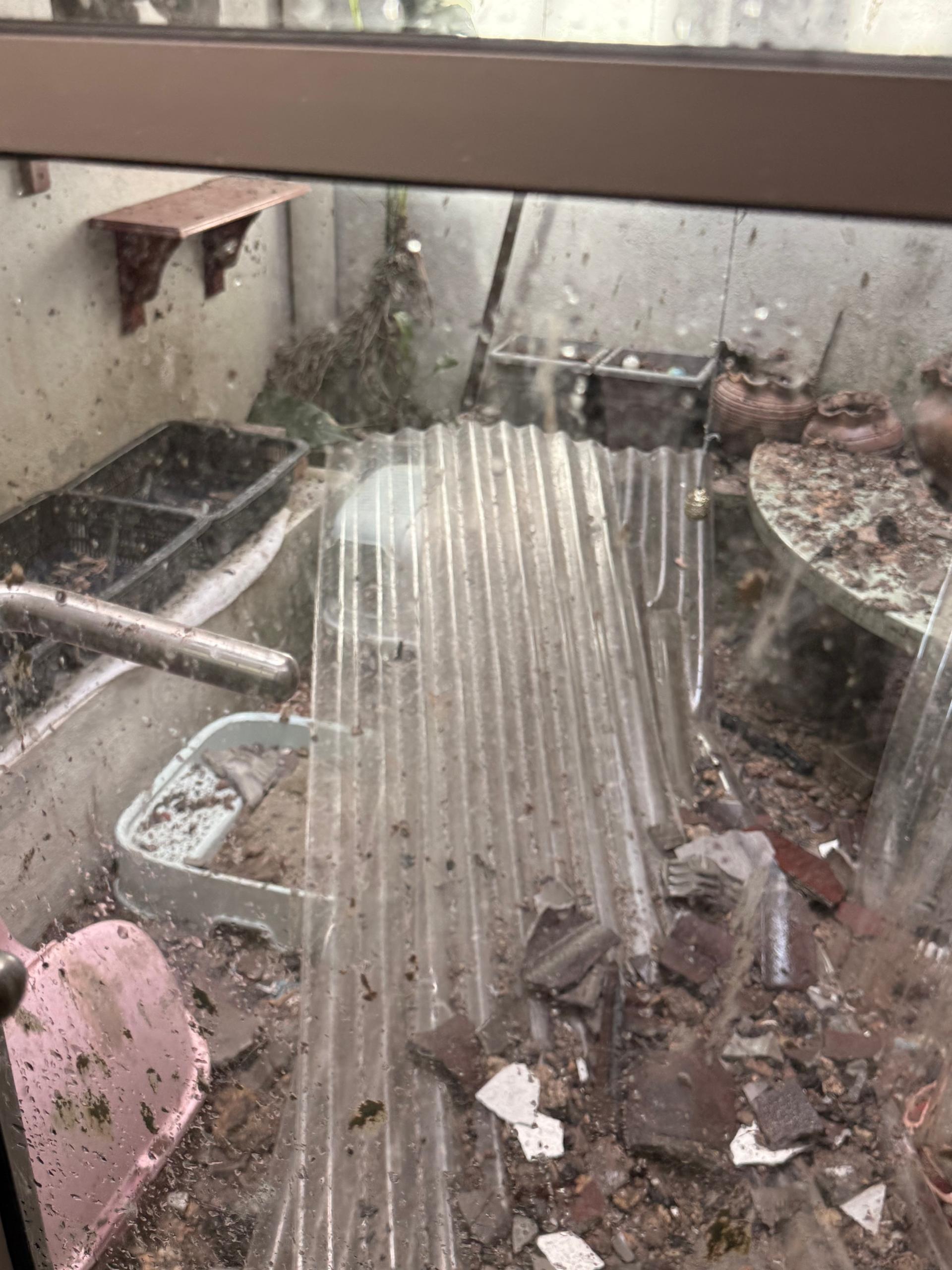 其中1名灾民的房子天花板悬挂在空中,本来藏在天花板的电线也暴露在外。