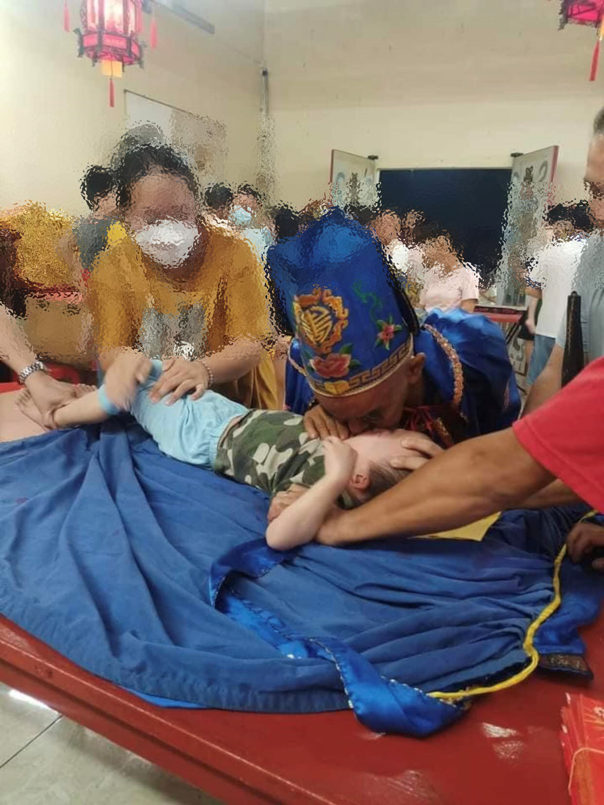 从上图可见,年幼的孩子被强迫躺在床上,并且挣扎着不想被年迈乩童与他用嘴巴接触,惟小孩的手脚皆被周围的大人压制住,使其动弹不得,只能由他。