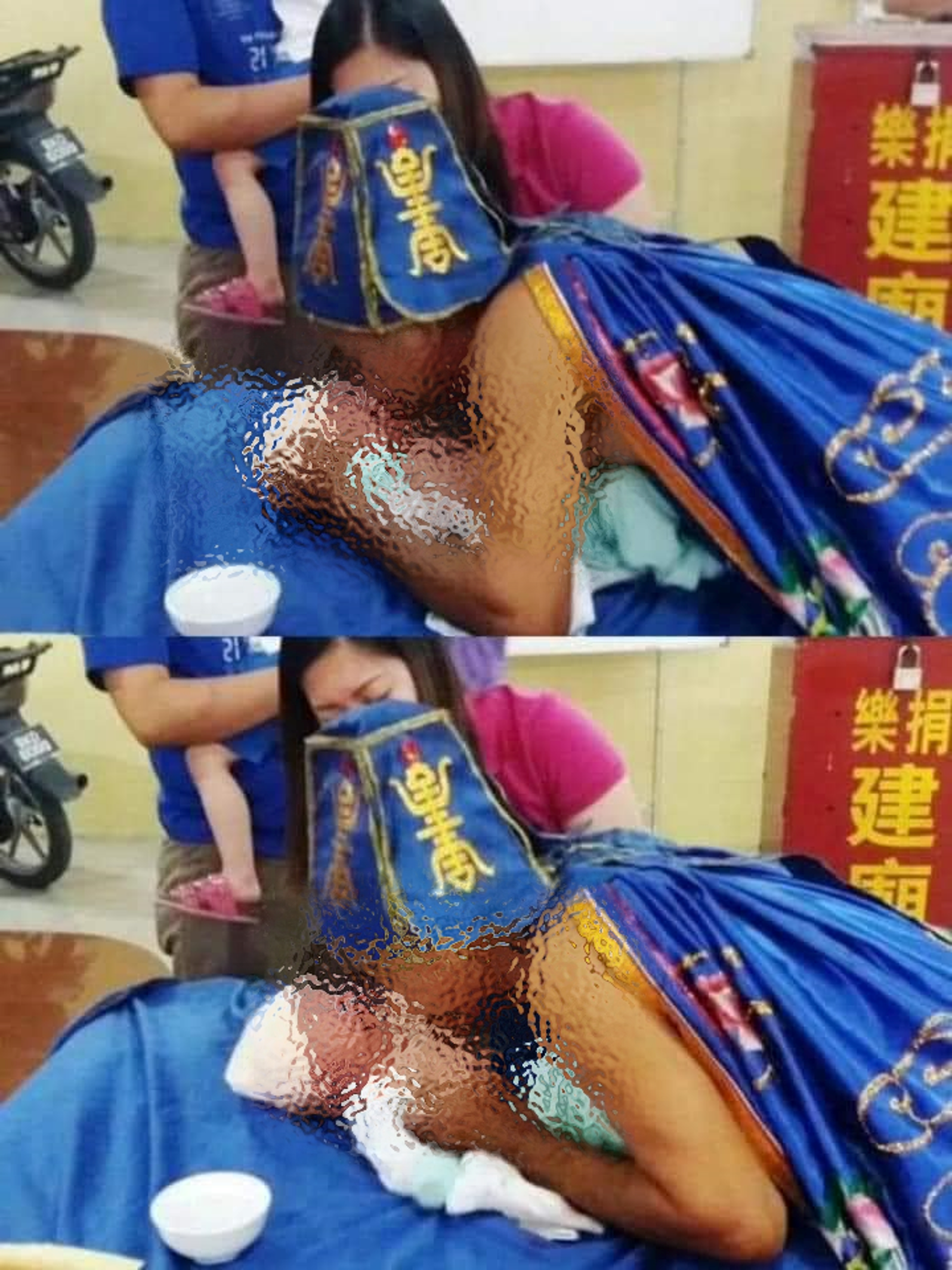 网民怒斥相关父母竟放任乩童用满血的舌头亲婴儿的敏感部位——胸部。