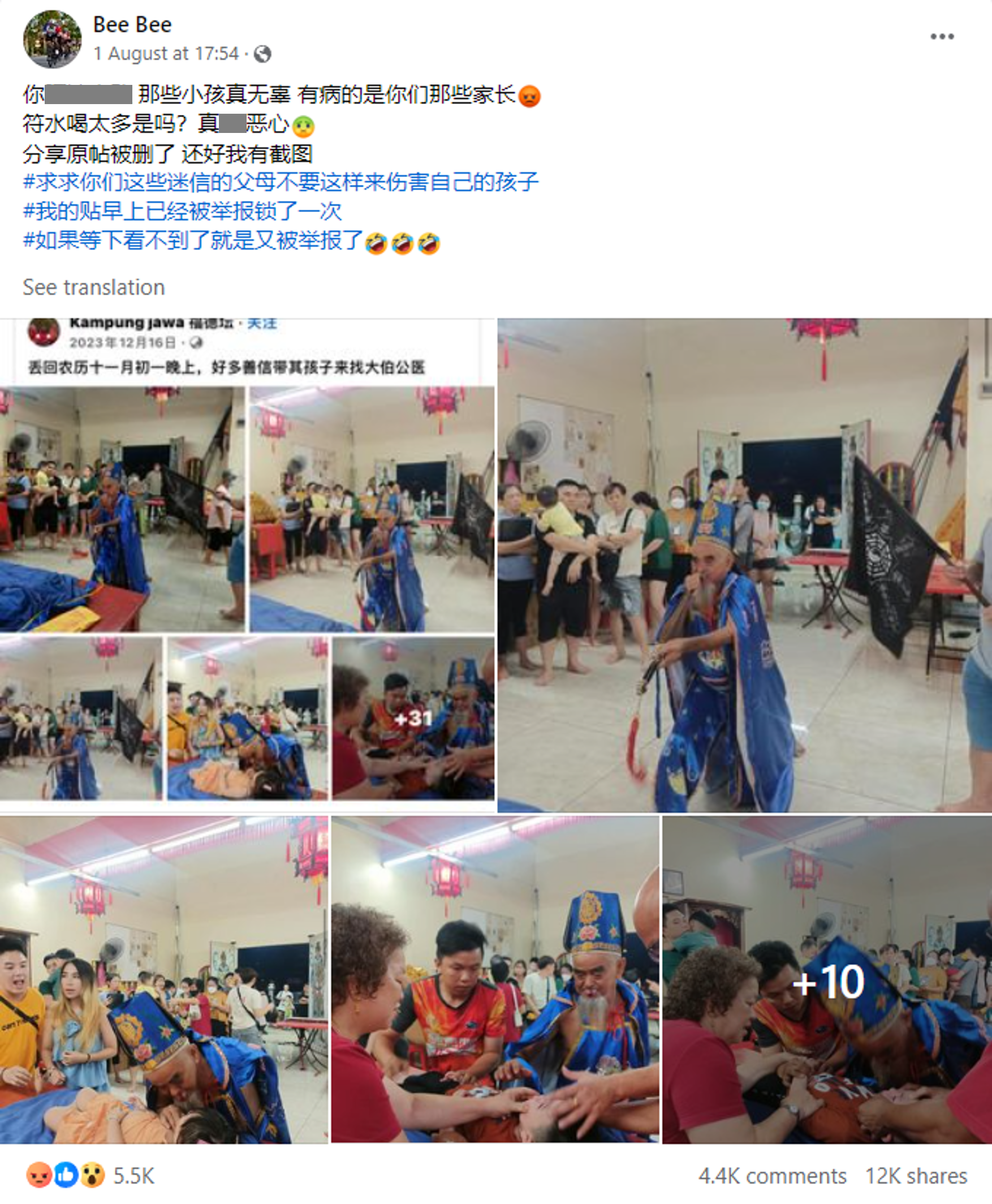 其中面子书署名为Bee Bee的用户,看不过乩童行为,在面子书发文炮轰,直斥相关父母过度迷信。
