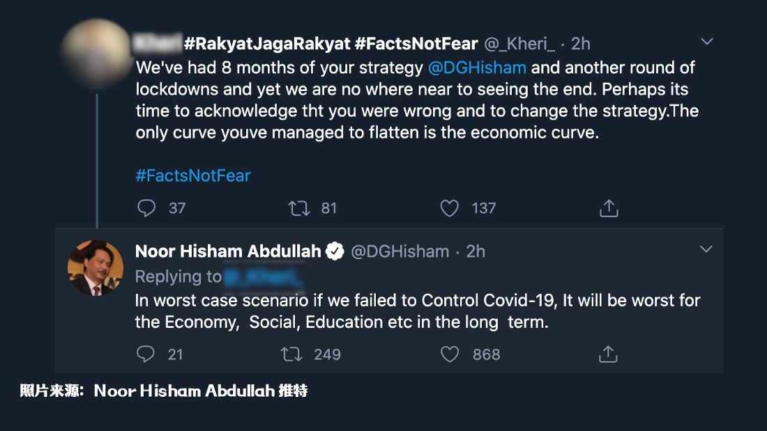 我国疫情再度爆发,导致沙巴、雪隆和布城重新落实条件式管制令(PKPB)。面对无止尽的“封城”,一名网民将责任归咎于卫生部的防疫策略。他在卫生总监诺希山的推特上留言,要诺希山承认封锁疫区策略的错误并需作出改变,指有关策略只是压平了“经济曲线”。