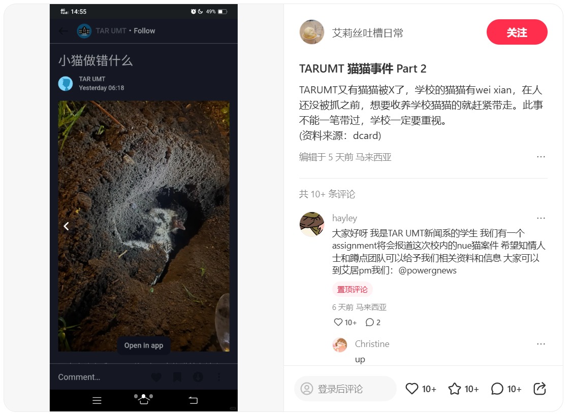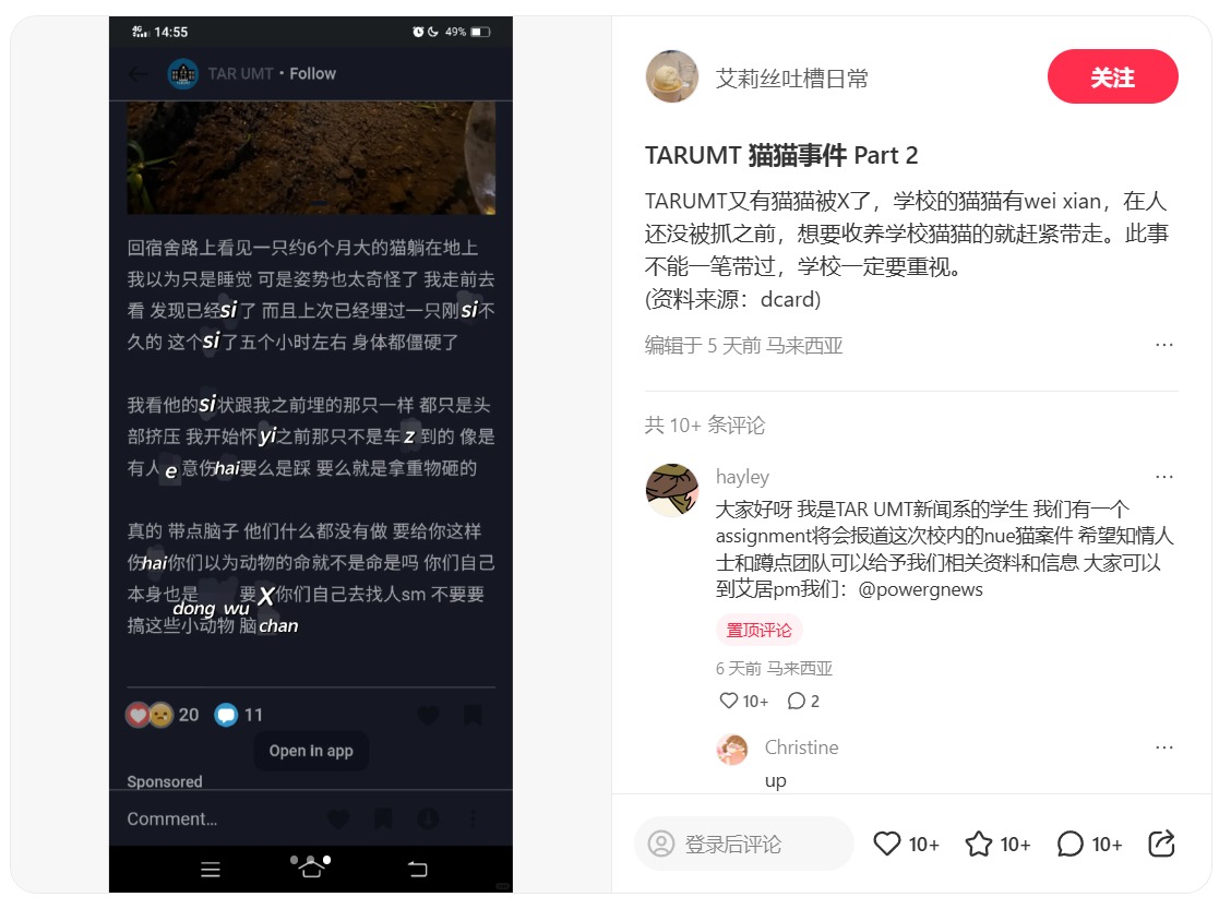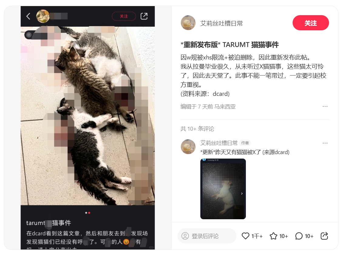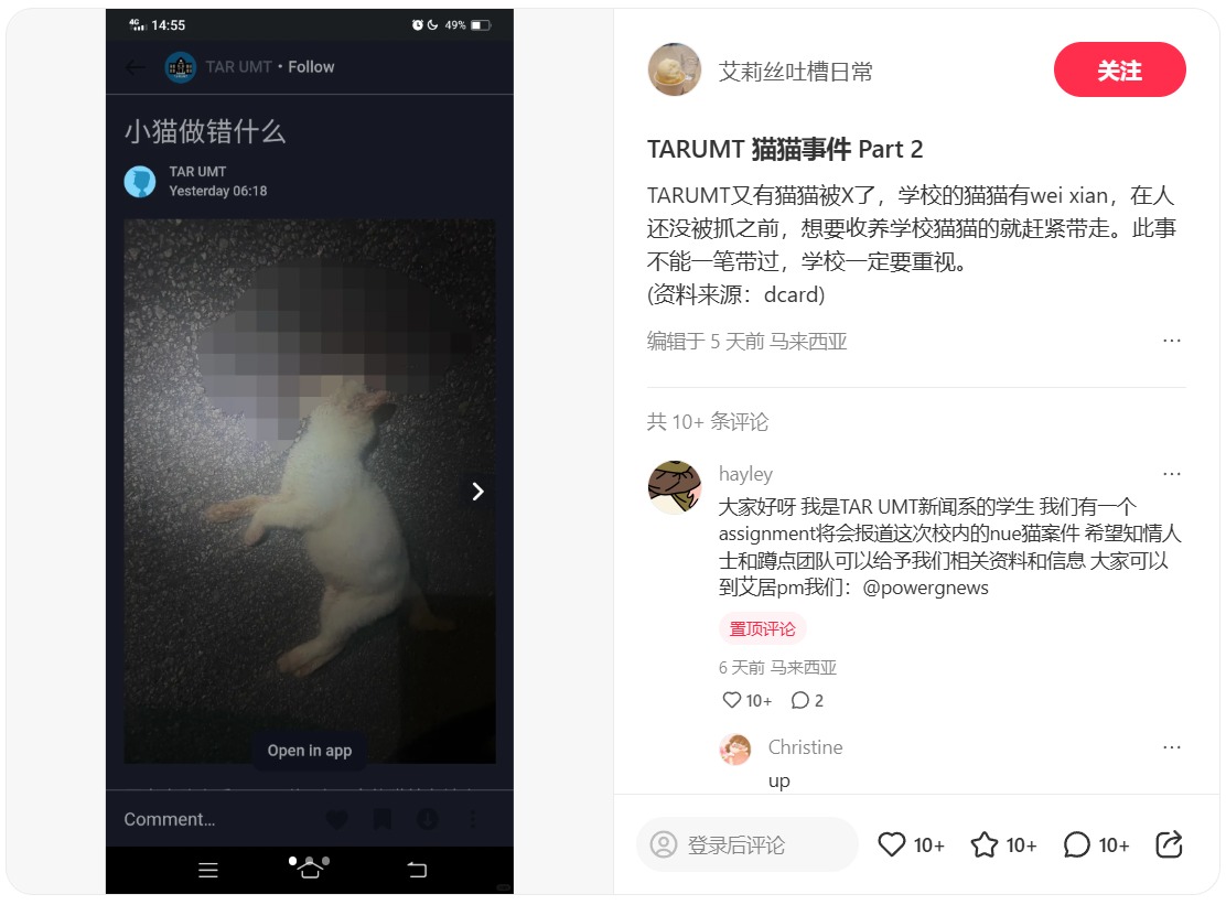 就在上述贴文被发布后的两天,该网民再次发文,并发布Dcard截图,指有人同样是在拉曼理工大学内,发现一只白色猫咪惨遭虐杀的事件!