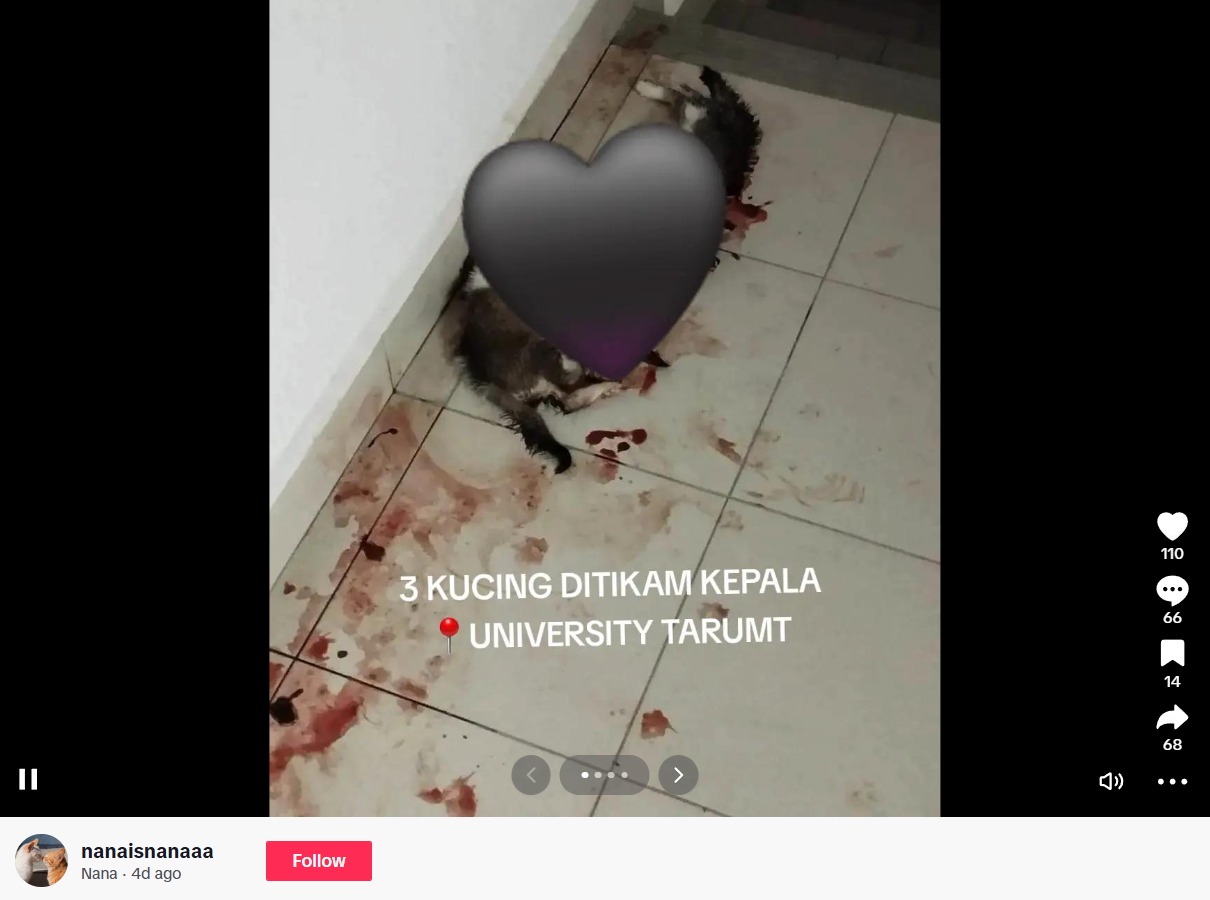 拉曼理工大学(TAR UMT)被爆传多宗虐猫事件!旺沙马朱警方接获投报,并以虐待动物角度开档调查于11月17日发生的3只小猫遭残杀的案件,惟有网民爆料,该大学内的虐猫事件不止这一宗!