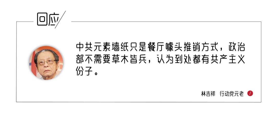 林吉祥表示,带有中共元素的墙纸,只是餐厅的噱头推销方式,政治部不需要草木皆兵,认为到处都有共产主义份子,更何况马中自1974年建交以来已经46年,我国没必要因为一面墙纸,破坏两国的友好关系。