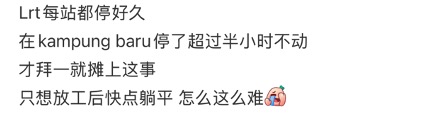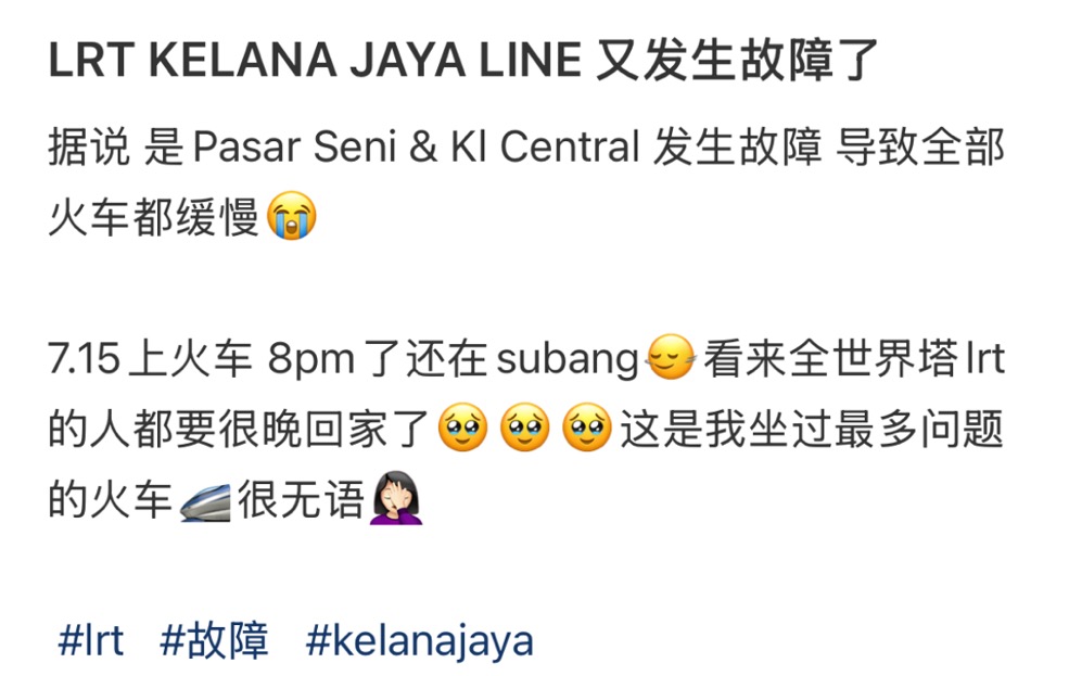 不少轻快铁乘客今天7PM左右,纷纷在社交媒体上抱怨格拉那再也轻快铁线出现故障。有的乘客透露他们迟迟等不到轻快铁到站,也有乘客控诉轻快铁在抵达每个站点时都长时间地中断服务。
