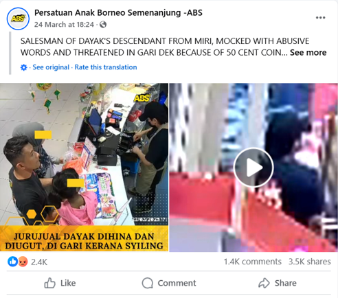婆罗洲半岛子民协会也在报道中,附上事发时的闭路电视影片。尽管影片没有声音,但仍可看到身穿黑衣的男子用手指着Carol,满脸怒火地指责对方。