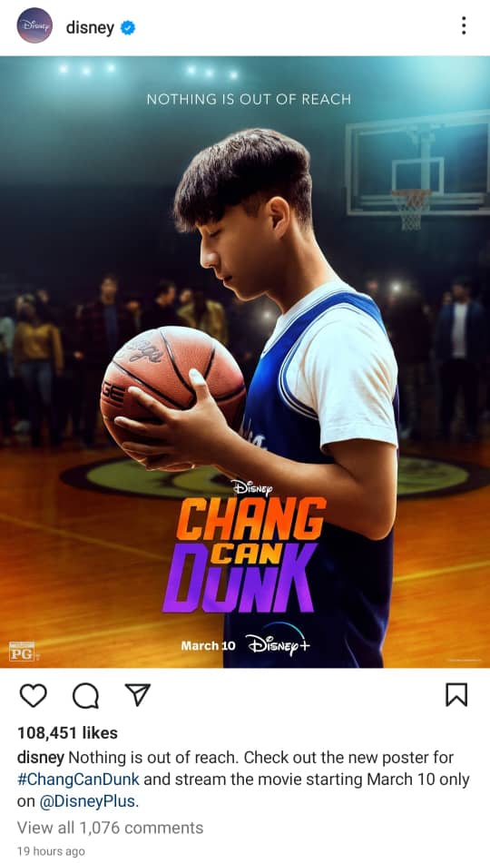 迪士尼今日在官方Instagram专页张贴海报,宣布将于3月10日,在串流平台Disney Plus上线一部以亚裔高中生为主角的篮球电影《Chang Can Dunk》。