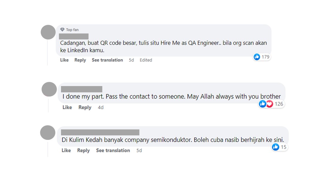 而这则贴文也引来当事人的留言,向在该页面关注他求职一事的网民表达谢意。