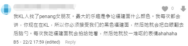 一名来自吉隆坡的网民则分享,自己跟槟城女朋友最大的乐趣,就是争论“福建面”到底应该是什么颜色。