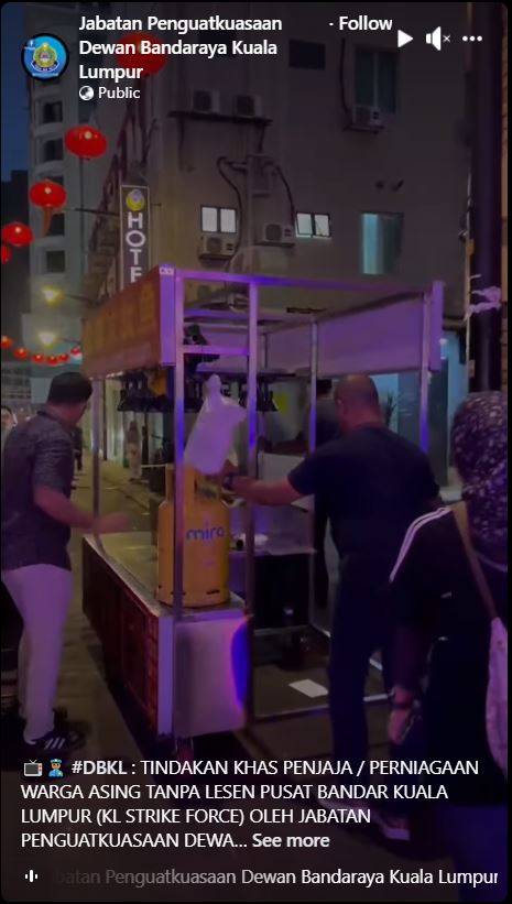 影片还可看到,执法人员也在热门美食街的阿罗街,没收由非法外劳经营的档口和用具,包括摊位、货物、桌子、帐篷等等。