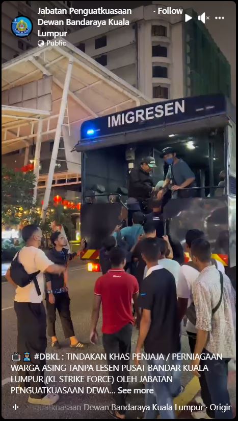 吉隆坡移民局在昨晚(1月22日)与吉隆坡市政局(DBKL)联手展开大规模取缔行动,在武吉免登(Bukit Bintang)逮捕了176名来自各国的非法外劳。
