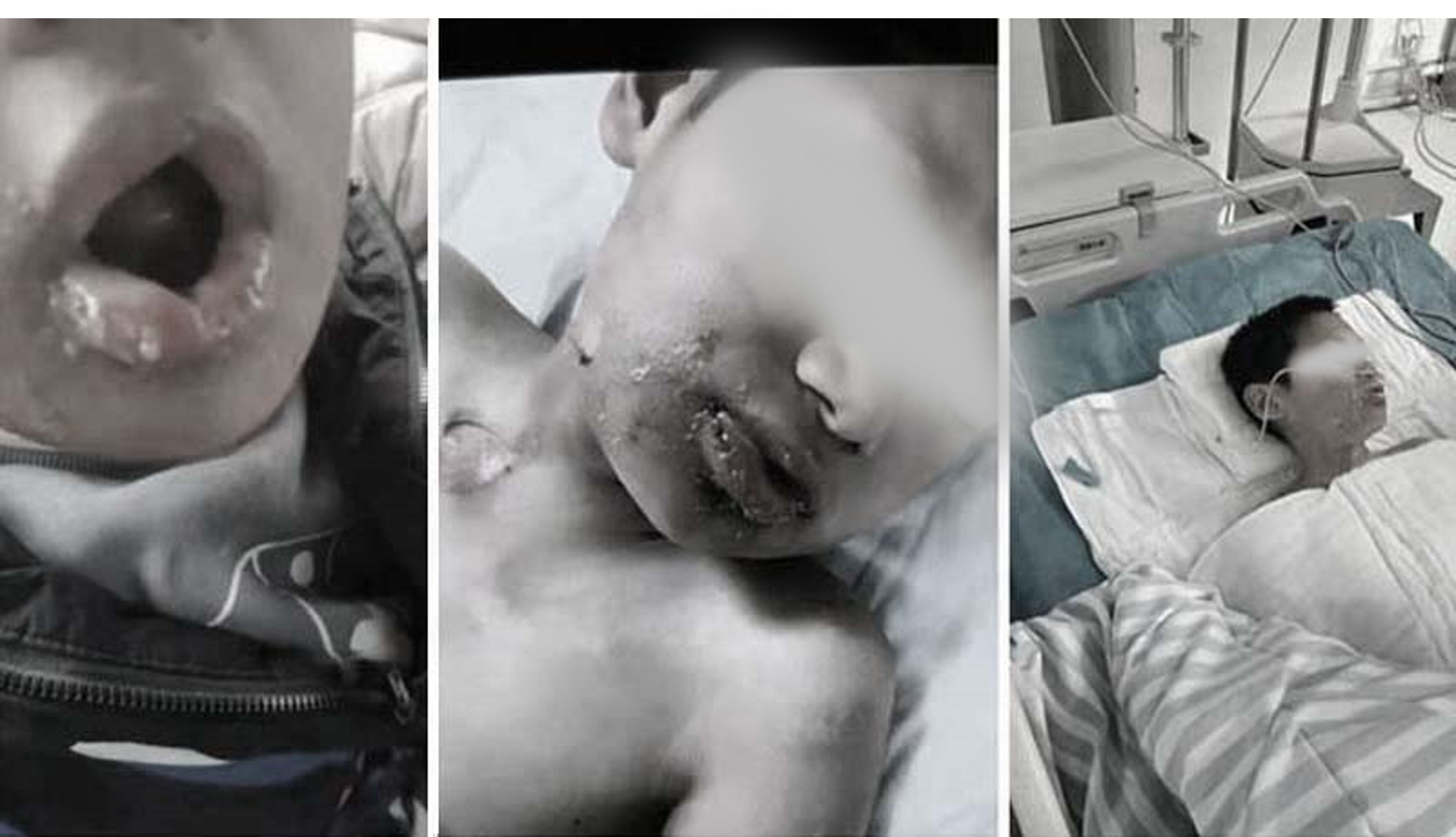 网上流传的照片显示,受害者的嘴巴被严重烫伤,红肿脱皮,起满了水泡。