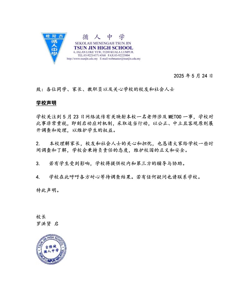 尽管贴文中并未揭露涉事的学校,不过吉隆坡循人中学的校长罗洪贤今天已经发文告指出,校方已经关注到网上流传有关映射循人中学一名老师涉及Metoo一事。“学校对此事非常重视,即刻启动应对机制,采取适当行动,以公正、中立且客观原则展开调查和处理。”