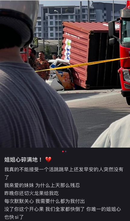 槟城大山脚昨天(11月13日)发生“集装箱压毙女子”的事件,导致一名21岁女生魂断公路。死者的姐姐在社交媒体上痛心发文,表示全家人无法接受这个噩耗,因为原本早上还活生生的家人,突然就离开了人世。