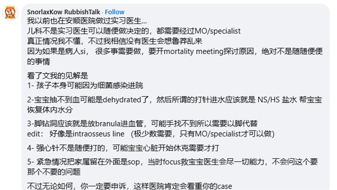女童阿姨的限时动态截图也被人分享到面子书上,网民“SnorlaxKow RubbishTalk”留言声称,自己以前在安顺医院当过实习医生。他解释说,实习医生不能随便做决定,需要经过驻院医生或是专科医生的同意。