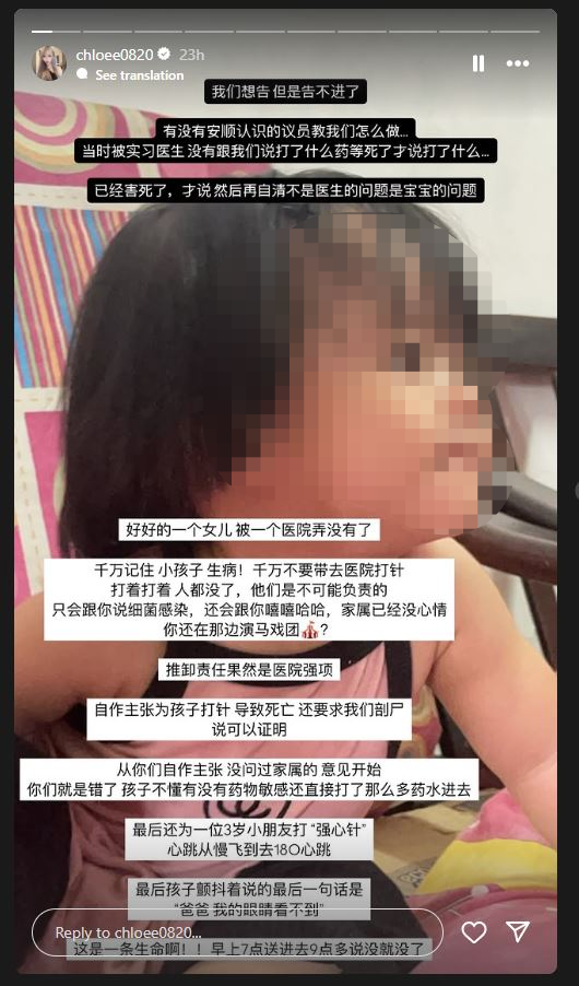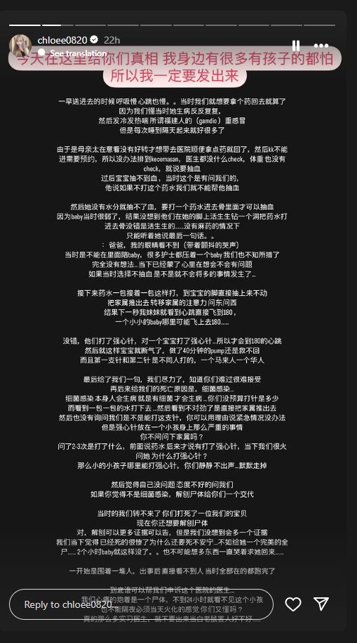 女童的阿姨在贴文中指出,女童的母亲看到孩子的心跳突然飞升到180,然后孩子就断气了,做了40分钟的急救还是没能救回孩子。她说,女童逝世后,医生告知家属,女童的死亡原因是细菌感染。