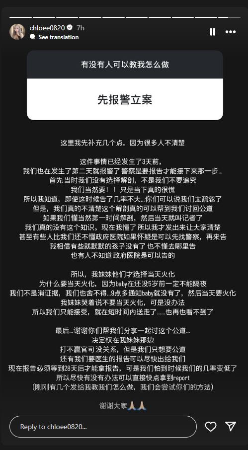 截图自 @chloee0820 Instagram 的限时动态。家属事发隔天已报警